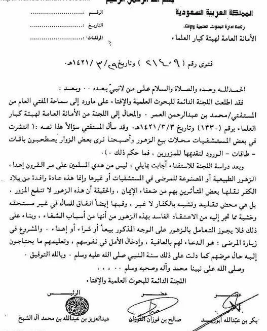 - الصورة هي صورة الفتوى، بتوقيع: عبد العزيز آل الشيخ (رئيس)، بكر أبو زيد، صالح الفوزان