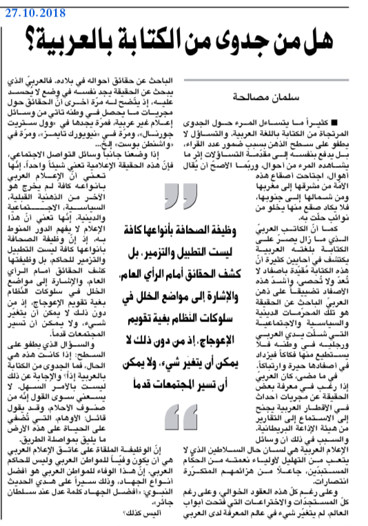 كثيرًا ما يتساءل المرء حول الجدوى المرتجاة من الكتابة باللغة العربية. والتساؤل لا يطفو على سطح الذهن بسبب ضمور عدد القراء، بل يدفع بنفسه إلى مقدّمة التساؤلات إثر ما يشاهده المرء من أحوال، وربّما الأصحّ أن يُقال أهوال، اجتاحت أصقاع هذه الأمّة من. مشرقها إلى مغربها ومن شمالها إلى جنوبها، فلا يكاد صقع منها يخلو من نوائب حلّت به.